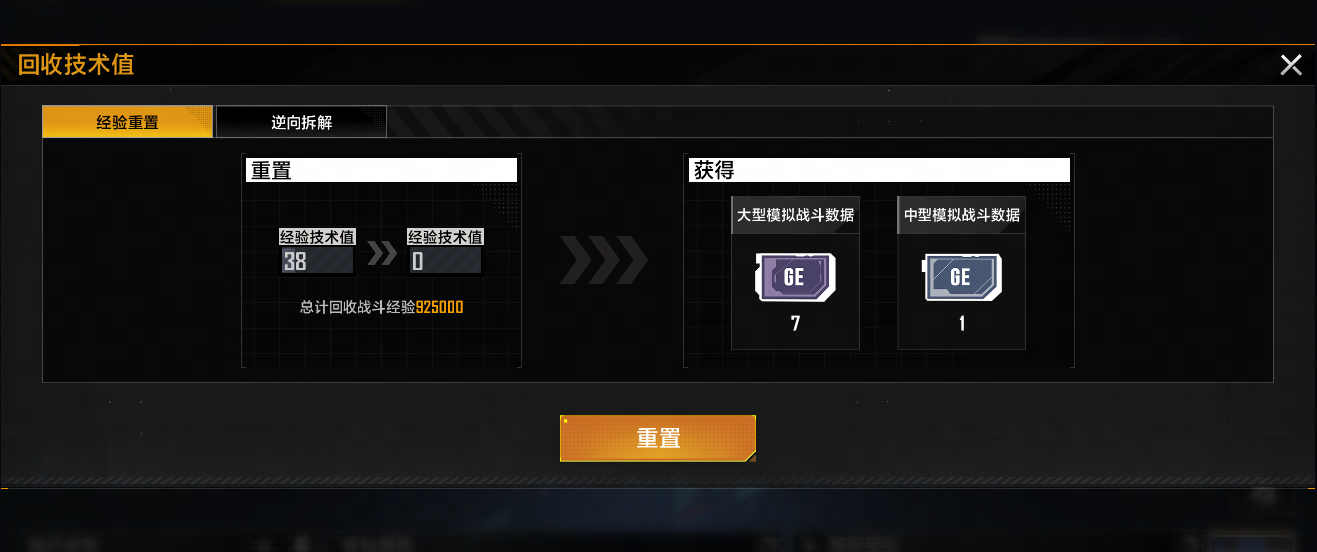 通过重置功能,可以将蓝图的所有经验值全部转化为通用战斗数据。